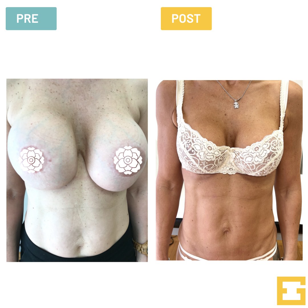 Decorso: Leggero gonfiore e possibili ecchimosi che si risolvono spontaneamente. I punti vengono rimossi dopo 10-12 gg. Medicazione nella sede d’incisione fino alla guarigione della ferita, e reggiseno contenitivo per c.a. 1 mese. In genere vengono posizionati due drenaggi nelle prime ore del post-operatorio